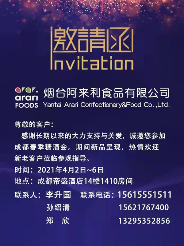 Our company will participate in the 105th National Food and Drinks Fair from April 2nd to 6th, 2021, which will be held in Room 1410, 14th Floor, Dorsett Chengdu Hotel.
